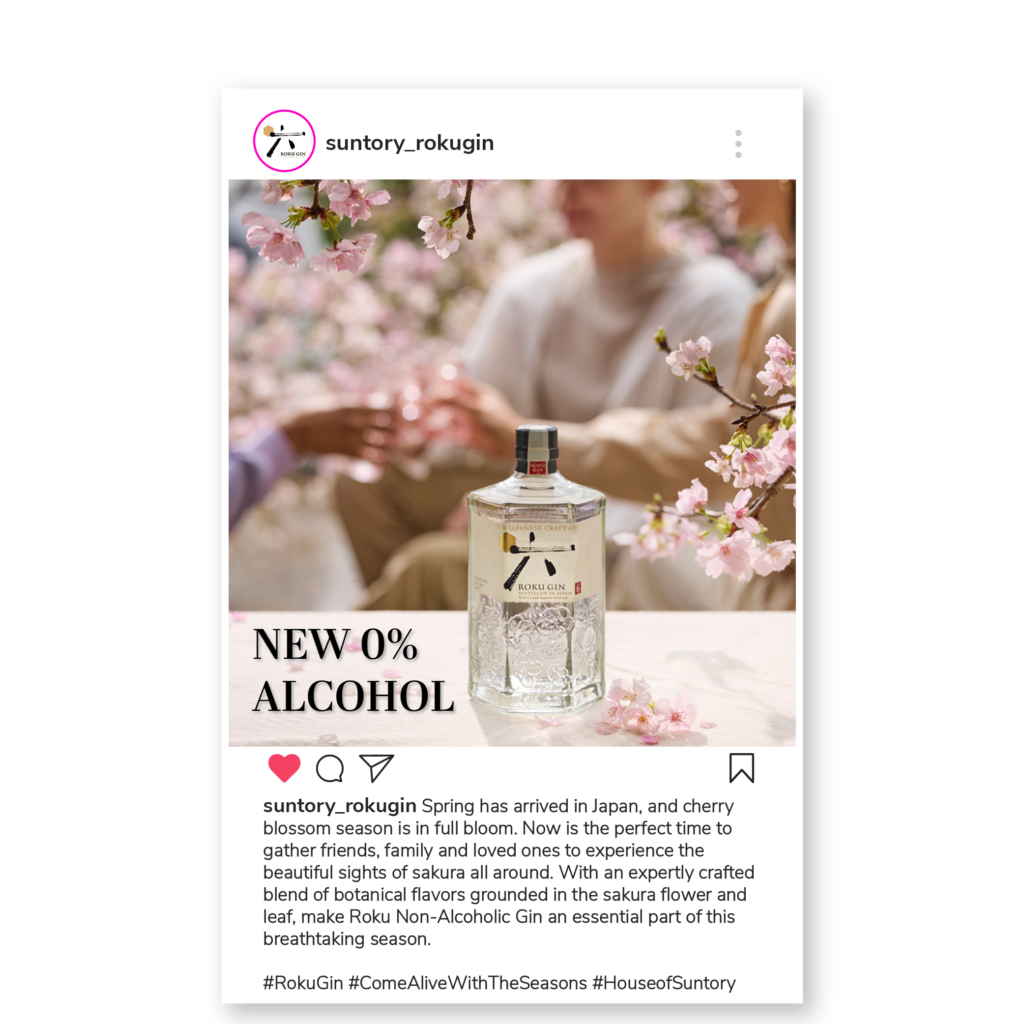 COPY: Spring has arrived in Japan, and cherry blossom season is in full bloom. Now is the perfect time to gather friends, family and loved ones to experience the beautiful sights of sakura all around. With an expertly crafted blend of botanical flavors grounded in the sakura flower and leaf, make Roku Non-Alcoholic Gin an essential part of this breathtaking season. #RokuGin #ComeAliveWithTheSeasons #HouseofSuntory