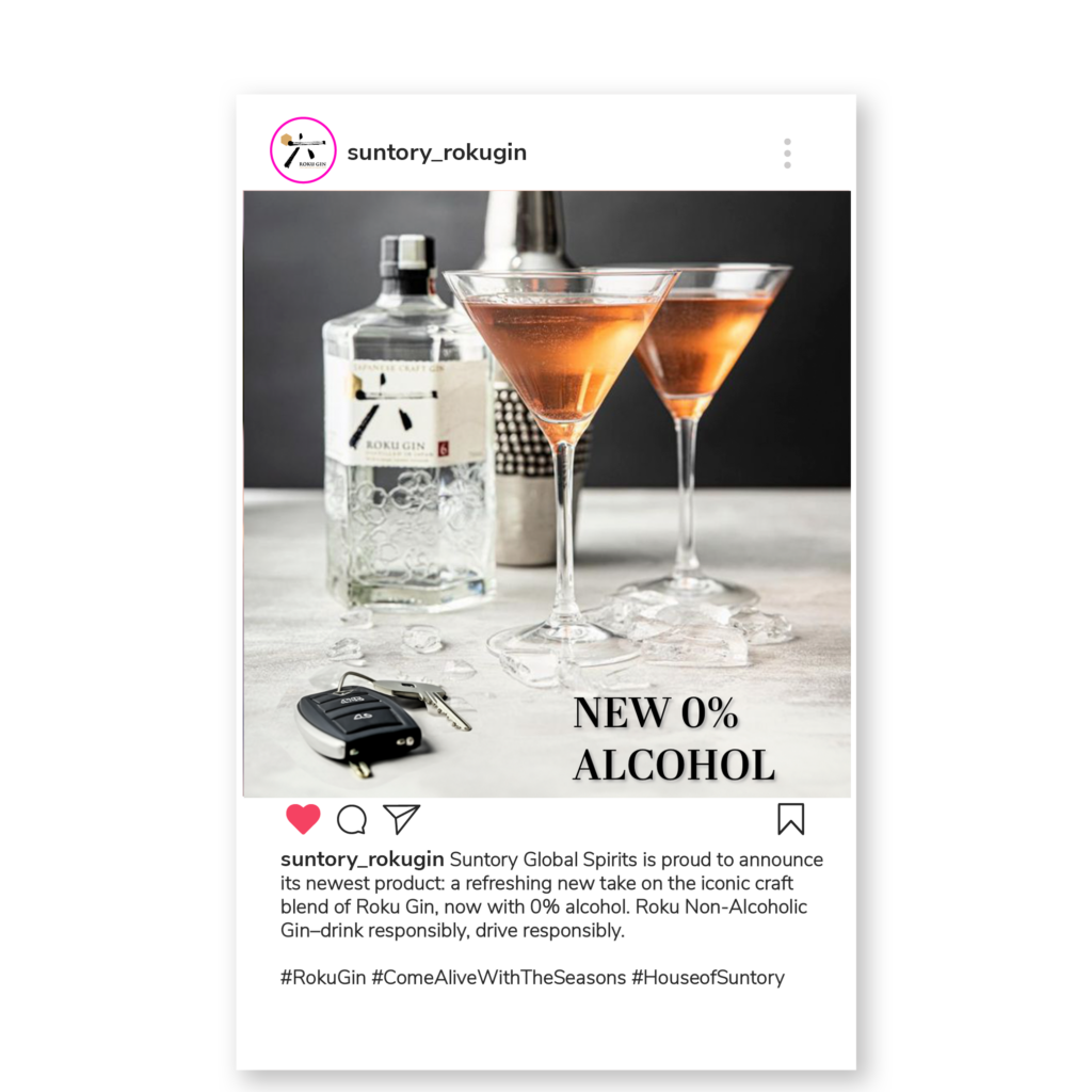 COPY: Suntory Global Spirits is proud to announce its newest product: a refreshing new take on the iconic craft blend of Roku Gin, now with 0% alcohol. Roku Non-Alcoholic Gin–drink responsibly, drive responsibly. #RokuGin #ComeAliveWithTheSeasons #HouseofSuntory
